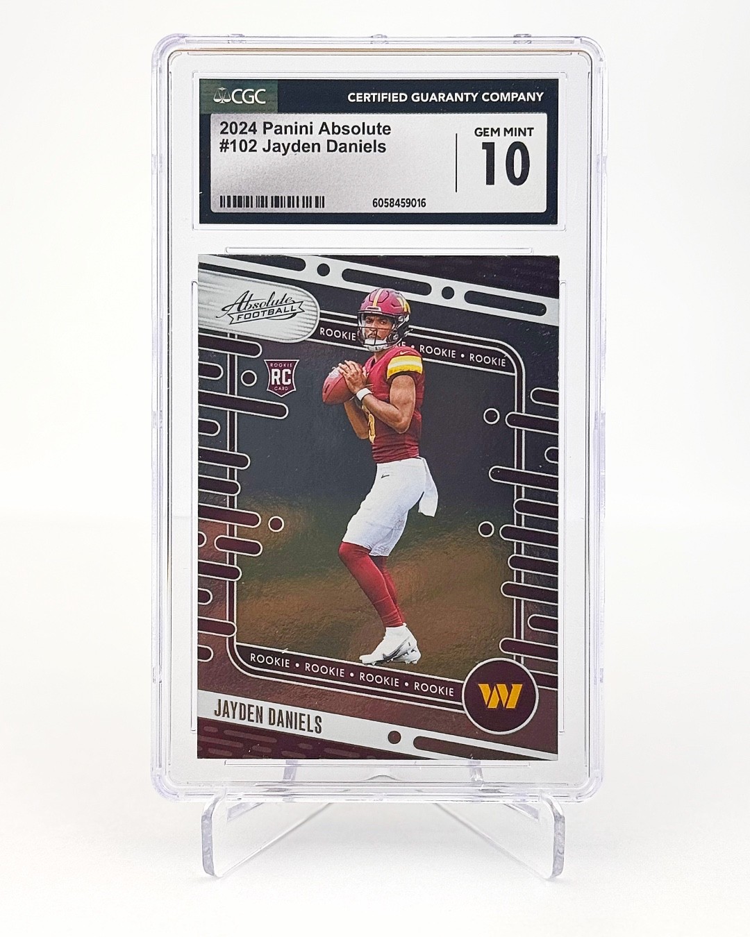 This listing is for a 2024 Absolute Jayden Daniels Rookie Card #102, showcasing the exciting quarterback now leading the Washington Commanders. Known for his elite speed, playmaking ability, and leadership, Daniels enters the NFL as one of the most exciting young talents in the league. Graded GEM MINT 10 by CGC, this card offers impeccable condition with perfect centering, sharp corners, pristine edges, and vibrant detail. It comes sealed in a tamper-evident CGC holder—perfect for both display and long-term investment.