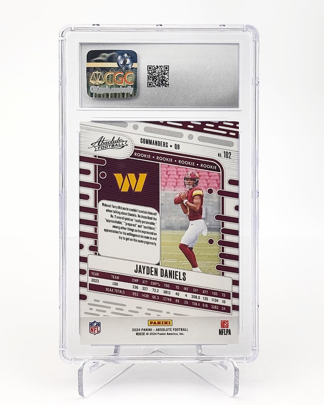 This CGC 10 GEM MINT 2024 Absolute Rookie Card #102 featuring Jayden Daniels is a must-have for any Washington Commanders fan or collector looking to add a pristine rookie card of the dynamic dual-threat quarterback.