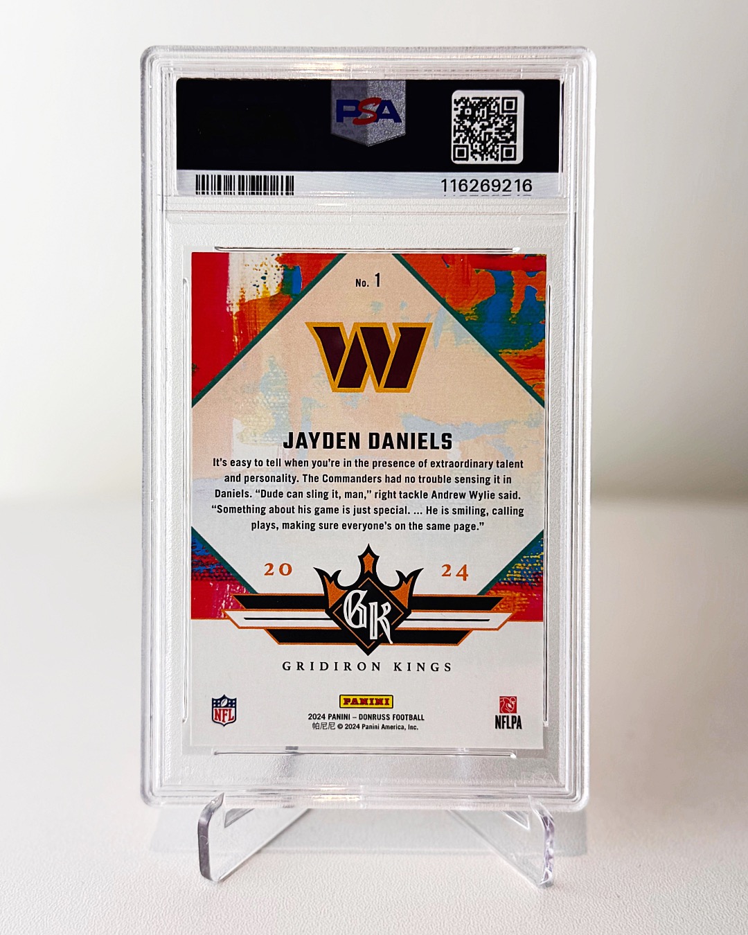 This PSA 9 MINT 2024 Donruss Gridiron Kings Rookie Card #1 featuring Jayden Daniels is a must-have for any Washington Commanders fan or collector looking to add a superb condition and artistic rookie insert of the dynamic dual-threat quarterback.